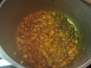 While the sausage is browning, put some olive oil in a large pot and add the onions, garlic, chili powder and cumin. Cook until the onion and garlc begin to soften and release their juices.